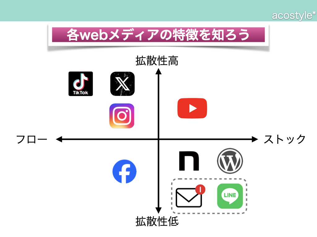 拡散性が高く、フロー型のメディアにはTikTok、X、LINEが、反対に拡散性は低いけど蓄積型のメディアにはnote、Wordpressといったブログやメルマガ、LINE公式アカウントが入っています。